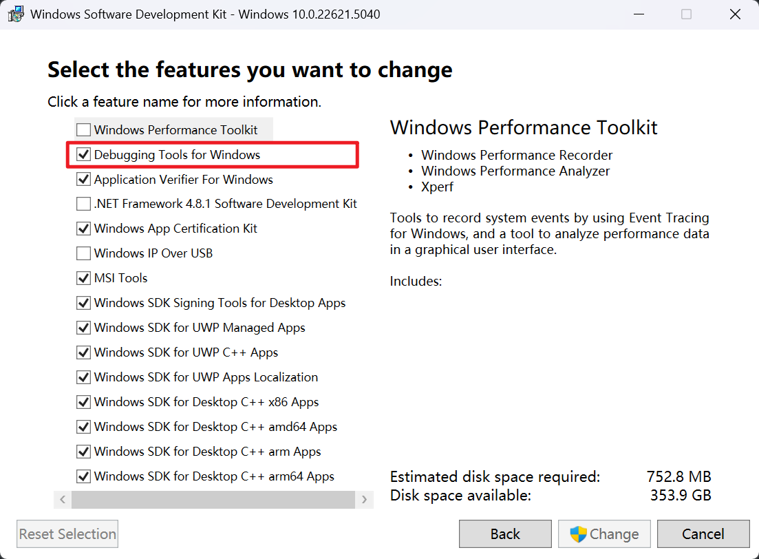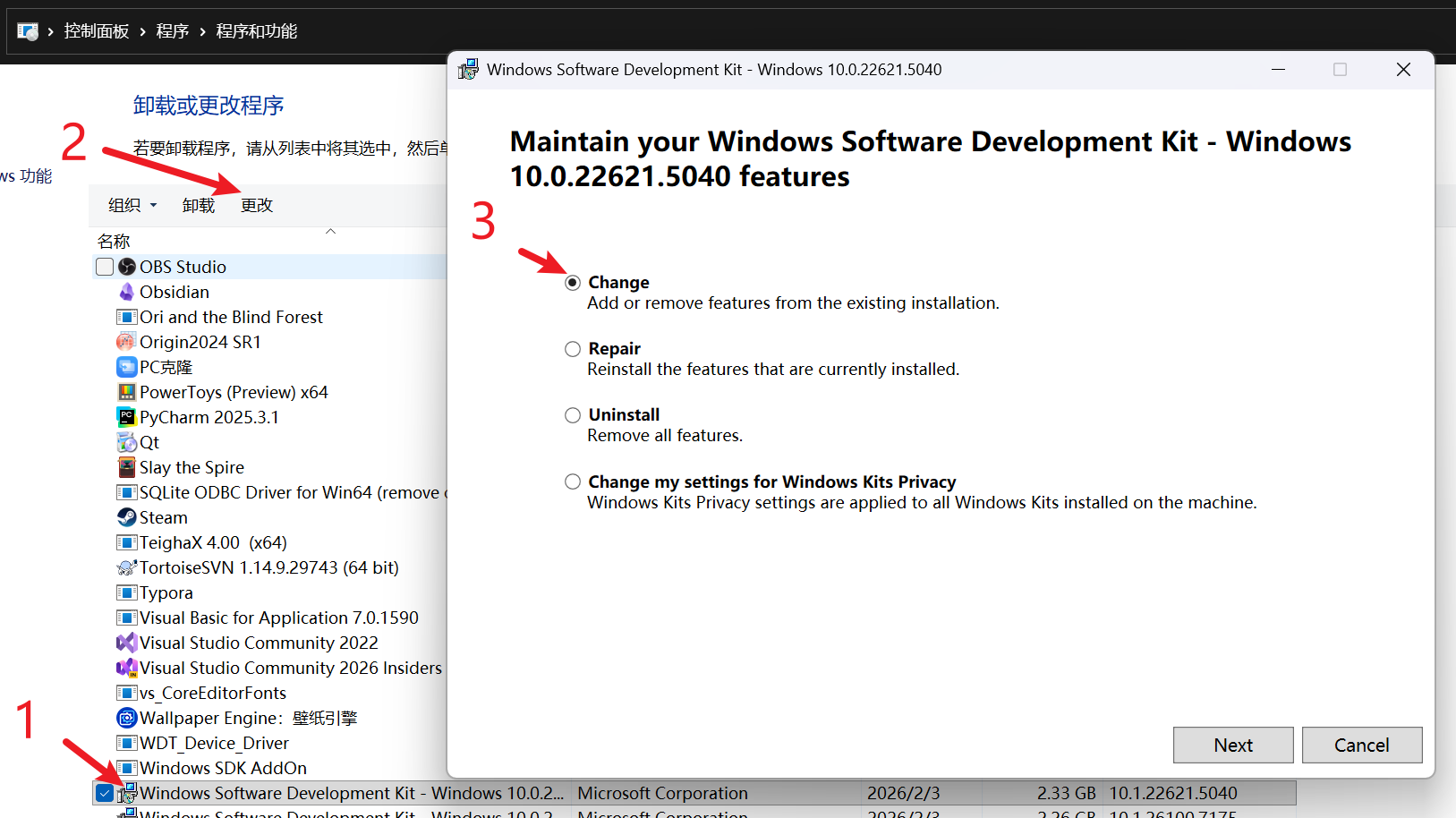 如果已经确认勾选了“CDB Debugger Support”,但是Qt中仍然没有调试器选项,应当确认Windows SDK中是否安装了调试工具,则需要在“控制面板”->“程序与功能”->“卸载程序”->“Windows SDK xxx”->“更改”并确认“Debugging Tools for Windows”是否正确安装。
