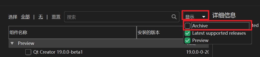笔者采用的在线安装器。Qt的版本为5.15.2。目前Qt官网的在线安装工具默认已经不显示Qt5的版本,需要在安装器中手动选择“显示->已归档”,才能看到,如下图所示。