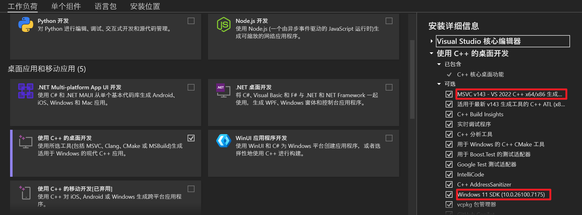需要选择"使用C++的桌面开发"功能包,在安装详细信息中需要勾选“MSVC v143 - VS 2022 C++ x64/x86 生成工具”Windows 11 SDK”(或者Windows 10 SDK)。