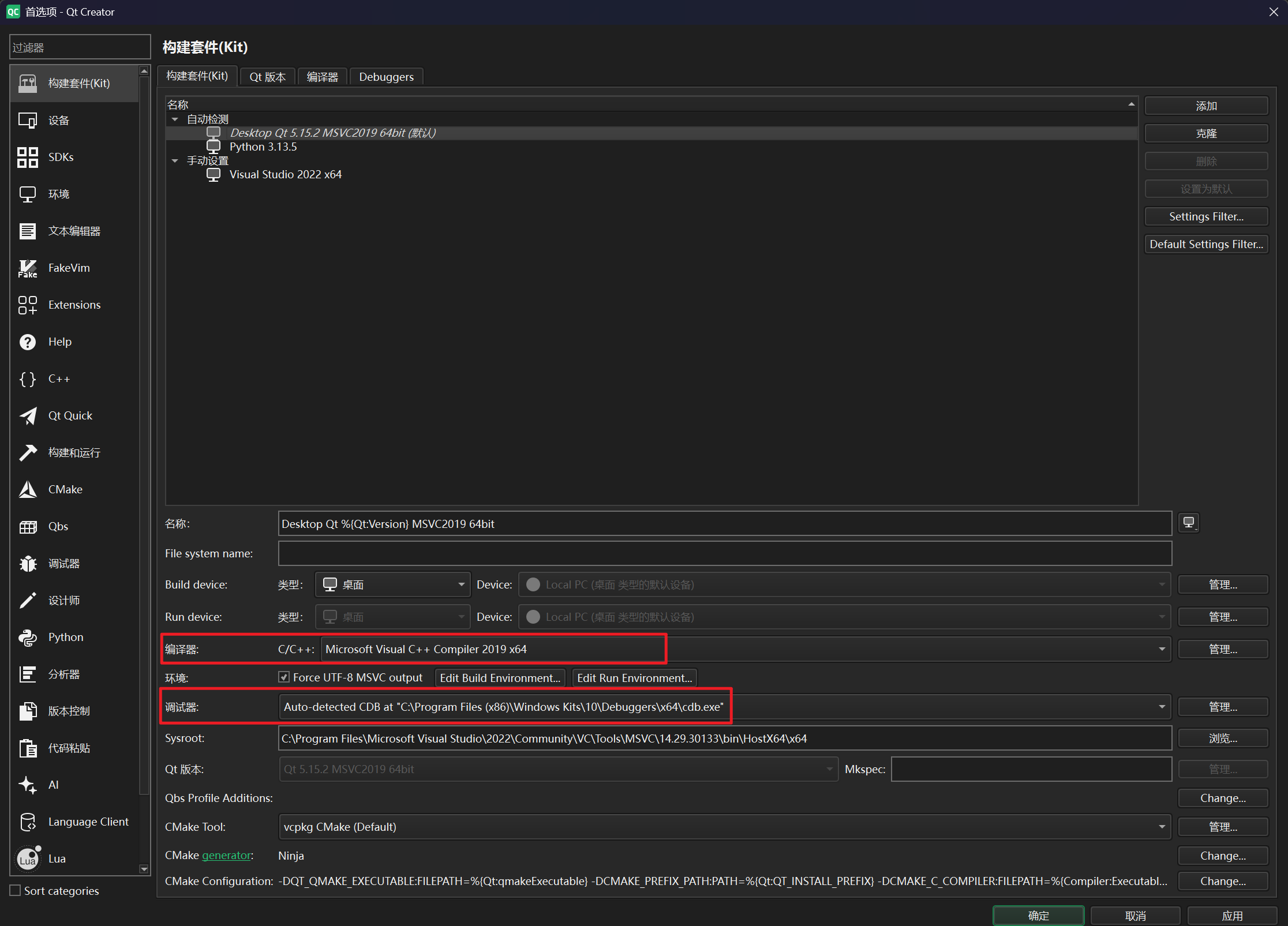 标红的两个部分必须是有效的。如果编译器中没有可选项,应当回到Qt安装界面中,确认“Qt 5.15.2”中的“MSVC 2019”组件是否勾选;如果调试器中没有可选项,应当回到Qt安装界面中,确认“CDB Debugger Support”是否勾选。
