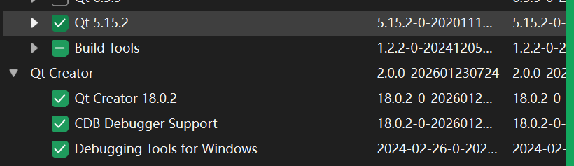 其中“Qt 5.15.2”中包含了Qt的库和MSVC的编译器接口(不包含编译器本身,编译器本身在上一步中通过Visual Studio installer已经完成了安装)。
